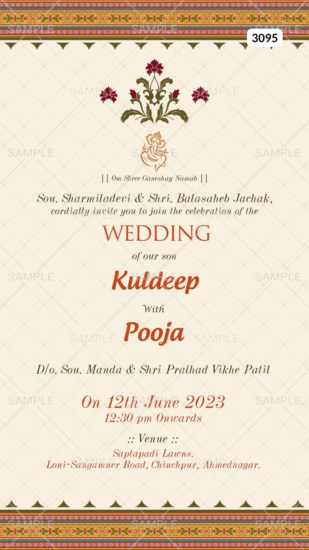 Wedding ceremony invitation card by canva of hindu maharashtrian marathi family in english language with vintage theme Canva Editable Template design 3095