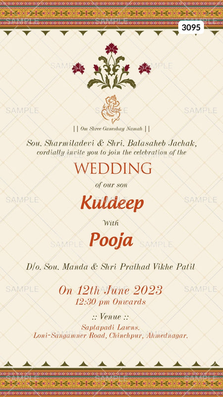 The vintage Theme of the Hindu Punjabi digital invitation Editable Canva Template for a wedding ceremony in cream background color. This e-invite editable template is perfectly suitable for the Marathi family and it's available in English language. It includes elements such as the Ganesha logo, red flowers, vintage pattern border. This card design can be customized online for free in Canva, and you can edit the couple's name, function name, date, time, venue, and regards. You can also share your card easily via WhatsApp or email.