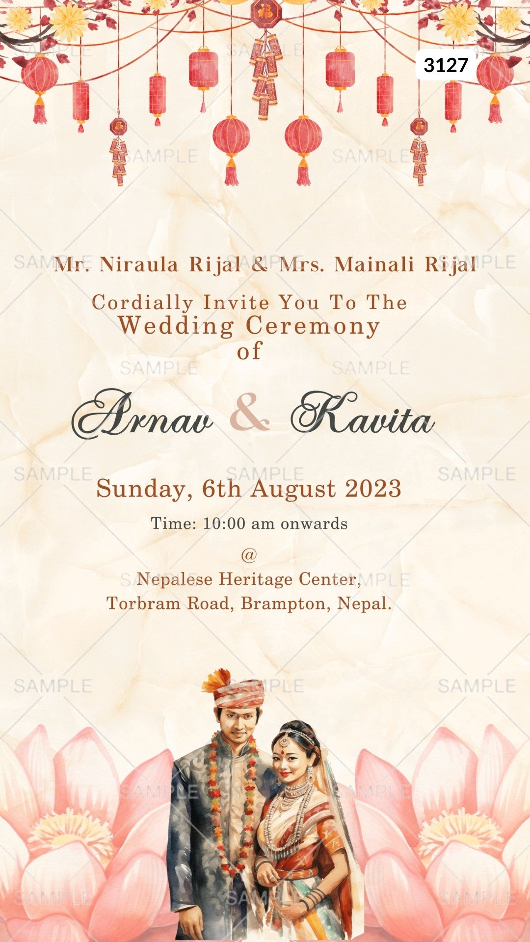 The floral Theme of the Hindu digital invitation Editable Canva Template for a wedding ceremony in light brown background color. This e-invite editable template is perfectly suitable for Nepali families and it's available in English language. It includes elements such as couple illustrations, pink flowers, lanterns, and yellow flowers. This card design can be customized online for free in Canva, and you can edit the couple's name, function name, date, time, venue, and regards. You can also share your card easily via WhatsApp or email.