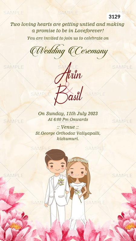 The floral Theme of the Hindu south indian digital invitation Editable Canva Template for a wedding ceremony in the light brown background color. This e-invite editable template is perfectly suitable for the Malayali family and it's available in the English language. It includes elements such as couple doodle, and pink flowers. This card design can be customized online for free in Canva, and you can edit the couple's name, function name, date, time, venue, and regards. You can also share your card easily via WhatsApp or email.