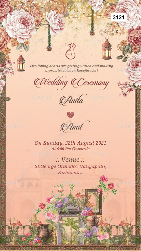 Wedding ceremony invitation card by canva of hindu south indian malayali family in english language with vintage theme Canva Editable Template design 3121