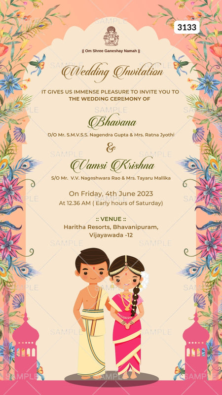 The traditional arch Theme of the Hindu south indian digital invitation Editable Canva Template for a wedding ceremony in the yellow background color. This e-invite editable template is perfectly suitable for the Telugu family and it's available in English language. It includes elements such as couple doodle, the ganesha logo, pink flowers, blue flowers, and peacock feathers. This card design can be customized online for free in Canva, and you can edit the couple's name, function name, date, time, venue, and regards. You can also share your card easily via WhatsApp or email.
