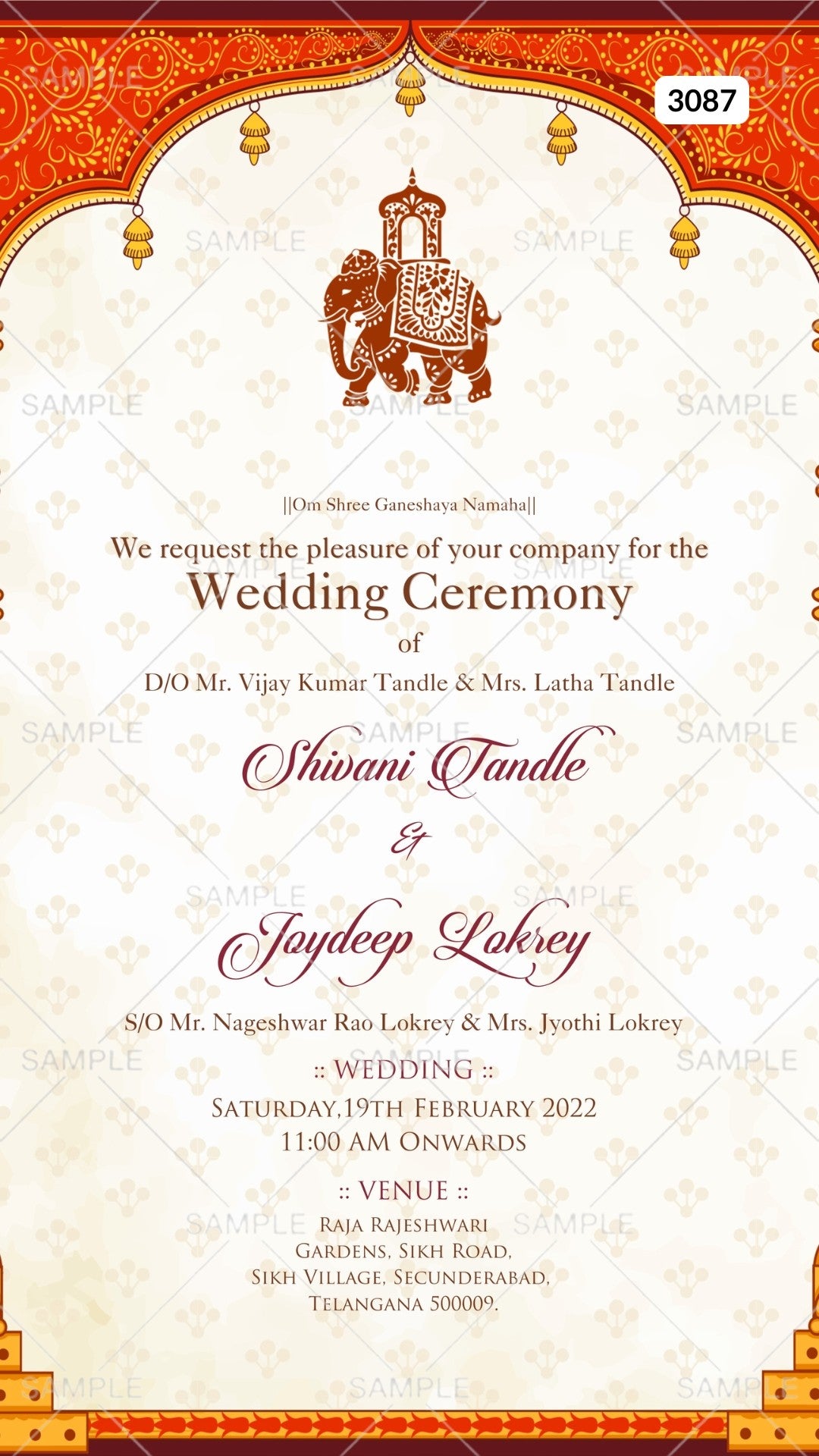 The traditional Theme of the Hindu south indian digital invitation Editable Canva Template for a wedding ceremony in the white background color. This e-invite editable template is perfectly suitable for the Telugu family and it's available in the English language. It includes elements such as an elephant, a red and orange arch, and yellow and brown patterns. This card design can be customized online for free in Canva, and you can edit the couple's name, function name, date, time, venue, and regards. You can also share your card easily via WhatsApp or email.