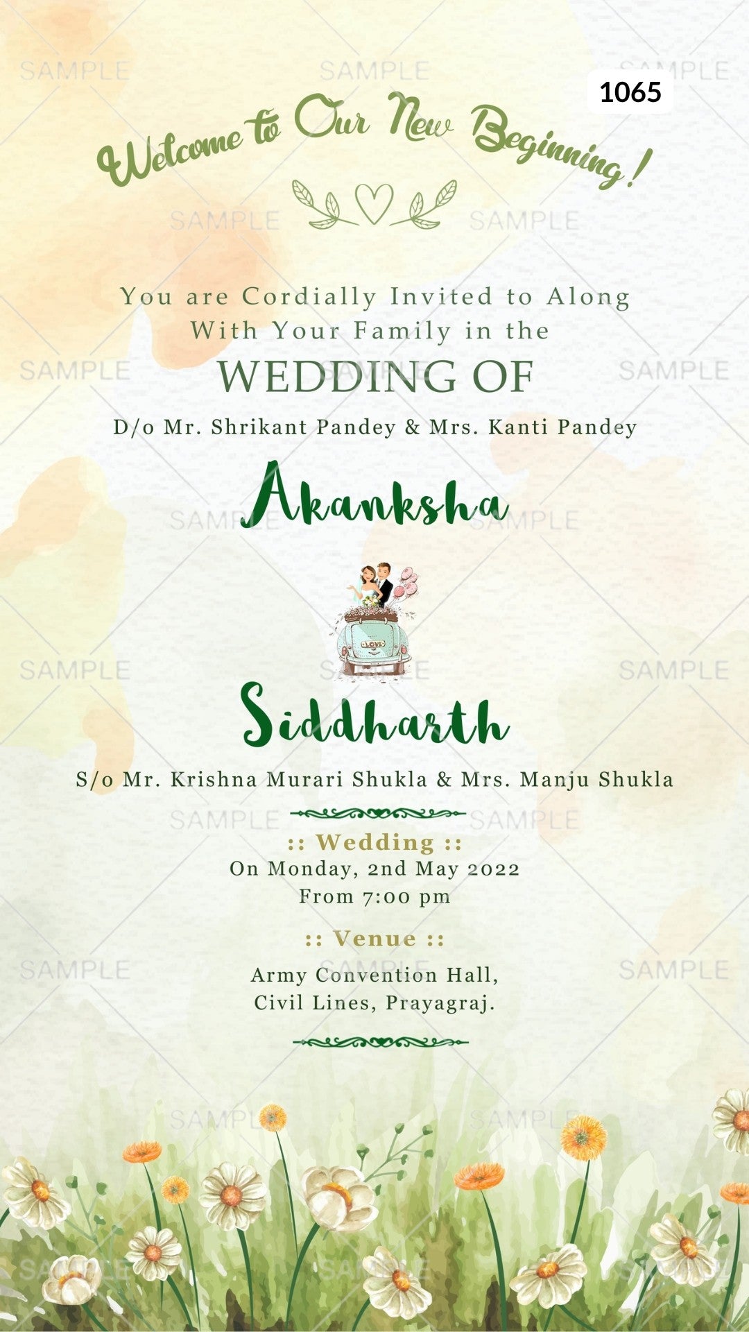 The garden Theme of the Hindu north indian digital invitation Canva Editable fror a wedding ceremony is in yellow splash background color. This e-invite editable template is perfectly suitable for the Bhojpuri family and it's available in English language. It includes elements such as a car, couple doodle, white flowers, and orange flowers. This card design can be customized online for free in Canva, and you can edit the couple's name, function name, date, time, venue, and regards. You can also share your card easily via WhatsApp or email.