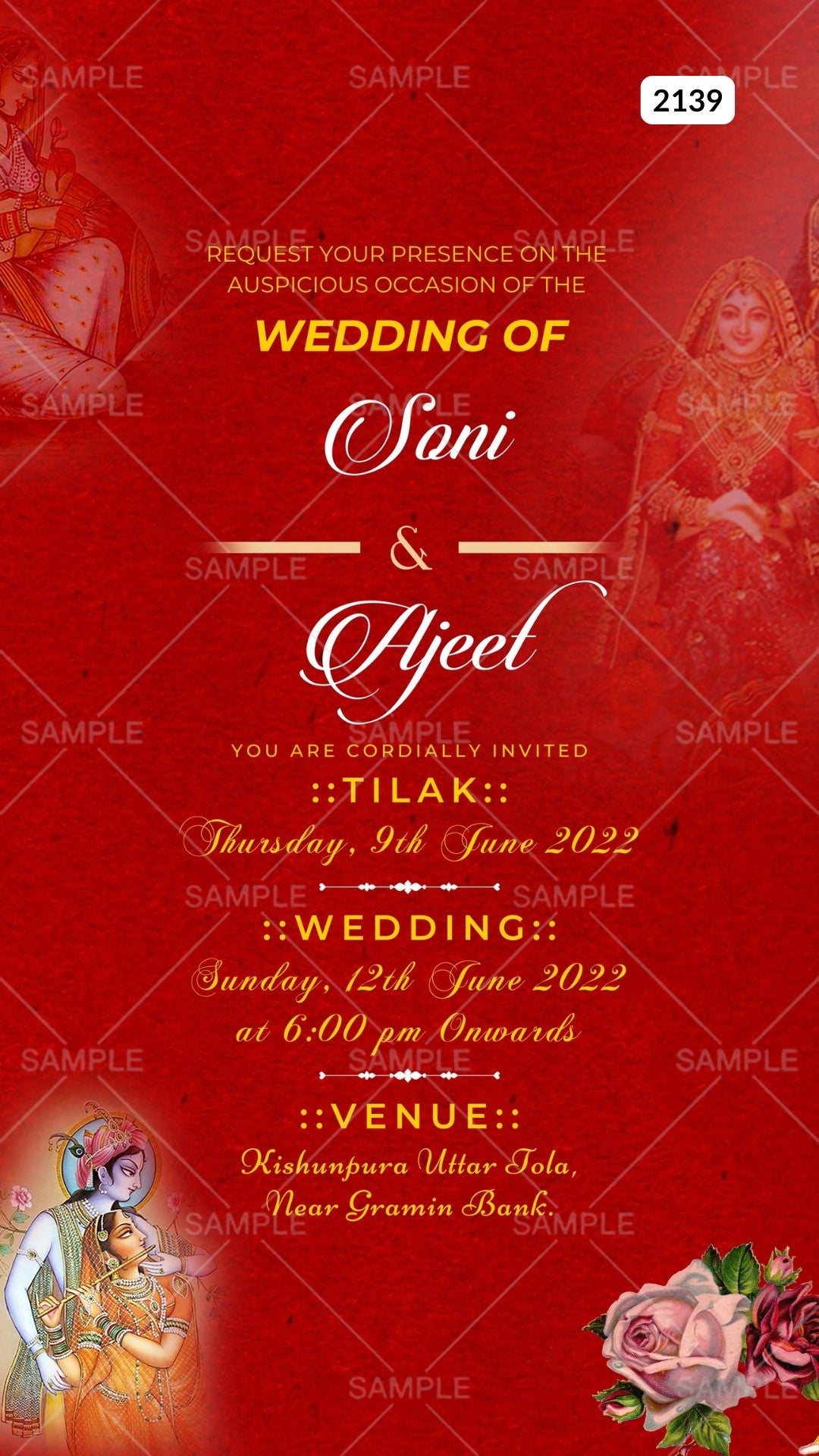 The minimalistic Theme of the Hindu digital invitation Canva Editable Template for a wedding ceremony in red background color. This e-invite editable template is perfectly suitable for the Bihari family and it's available in English language. It includes elements such as the Radha Krishna image, red flowers, pink flowers, and Mughal paintings. This card design can be customized online for free in Canva, and you can edit the couple's name, function name, date, time, venue, and regards. You can also share your card easily via WhatsApp or email.