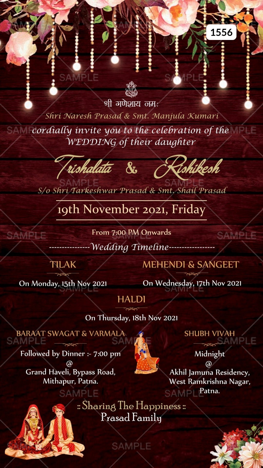 The wooden shining Theme of the Hindu digital invitation Canva Editable Template for a wedding ceremony is in the wooden background color. This e-invite editable template is perfectly suitable for the Bihari family and it's available in English language. It includes elements such as pink flowers, white flowers, a lamp, a wedding couple doodle, Ganesha logo. This card design can be customized online for free in Canva, and you can edit the couple's name, function name, date, time, venue, and regards. You can also share your card easily via WhatsApp or email.
