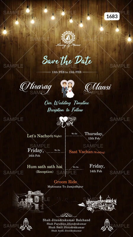 The timeline Theme of the Hindu Gujarati digital invitation Canva Editable Template for a wedding ceremony is in wooden background color. This e-invite editable template is perfectly suitable for the Jain family and it's available in the English language. It includes elements such as a Couple doodle, a couple logo, lamps, a paper plane, namaste icon. This card design can be customized online for free in Canva, and you can edit the couple's name, function name, date, time, venue, and regards. You can also share your card easily via WhatsApp or email.