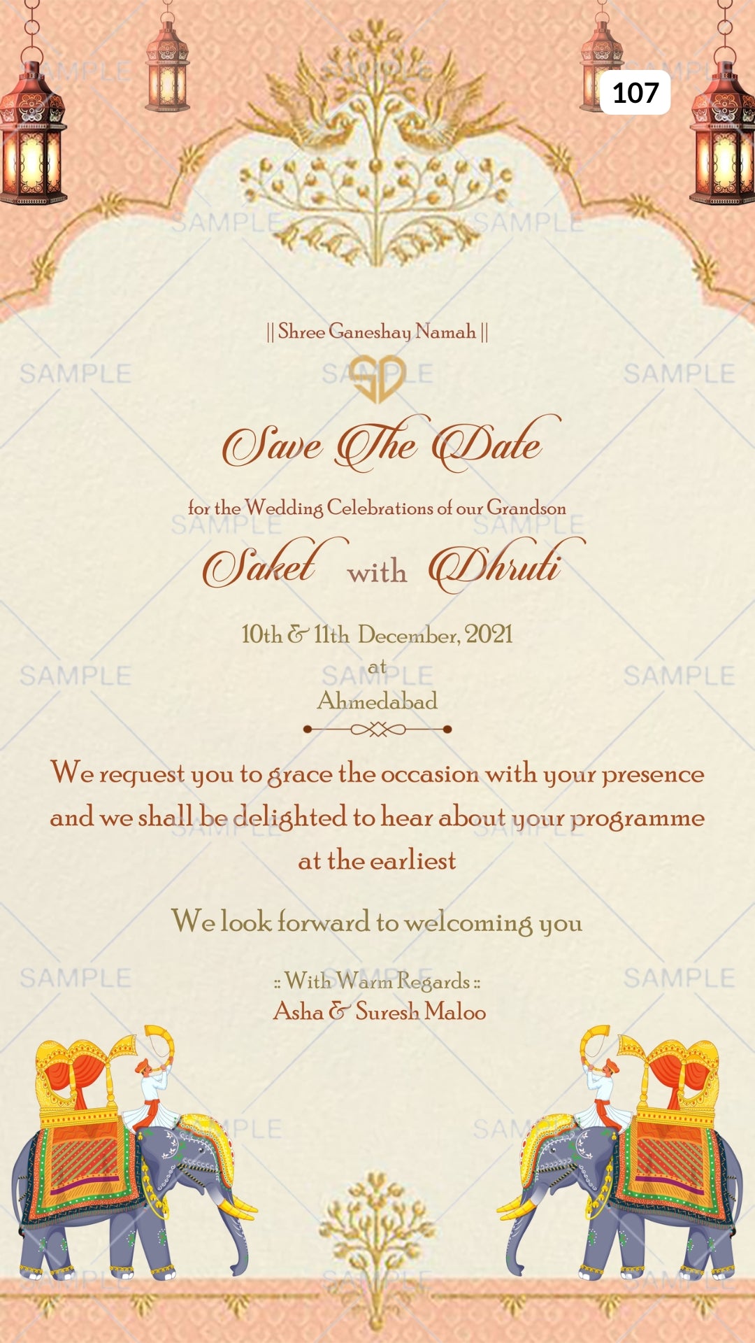 The Traditional Arch Theme of the Hindu Gujarati digital invitation Canva Editable for a wedding ceremony is in Cream, orange background color. This e-invite editable template is perfectly suitable for the Patel family and it's available in English language. It includes elements such as the Couple logo, lantern, elephants, birds, and golden flower pattern. This card design can be customized online for free in Canva, and you can edit the couple's name, function name, date, time, venue, and regards. You can also share your card easily via WhatsApp or email.