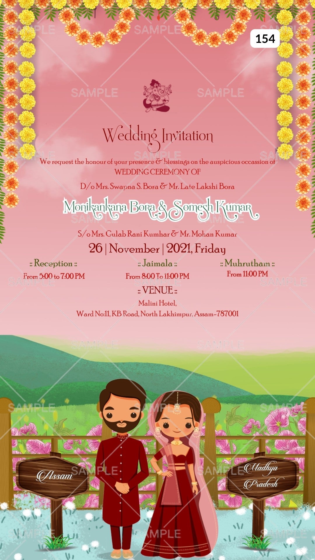 The Traditional Theme of the Hindu digital invitation Canva Editable for wedding ceremonies in a pink splash background color. This e-invite editable template is perfectly suitable for the Assamese family and it's available in English language. It includes elements such as a wooden board, fence, grass, pink flowers, a mountain, a marigold garland, a Ganesha logo, couple doodle. This card design can be customized online for free in Canva, and you can edit the couple's name, function name, date, time, venue, and regards. You can also share your card easily via WhatsApp or email.