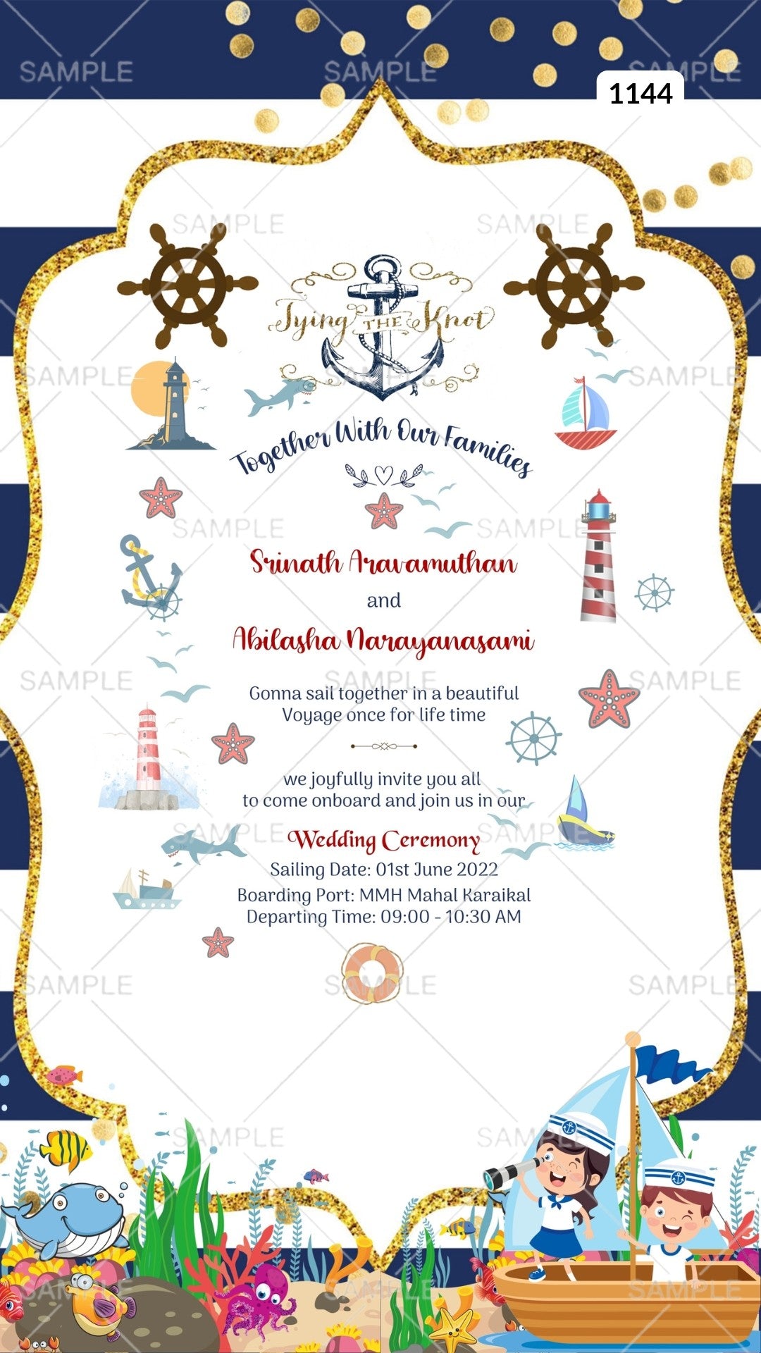 The floral Theme of the Hindu Hindu digital invitation Canva Editable Template for a wedding ceremony is blue, the background color. This e-invite editable template is perfectly suitable for south indian families and it's available in the English language. It includes elements such as a glittery frame, golden glitter, fish, doodle, starfish, boat, leaves, tulips, jellyfish, stone, birds, navy anchor, and ship steering wheel. This card design can be customized online for free in Canva, and you can edit the couple's name, function name, date, time, venue, and regards. You can also share your card easily via WhatsApp or email.