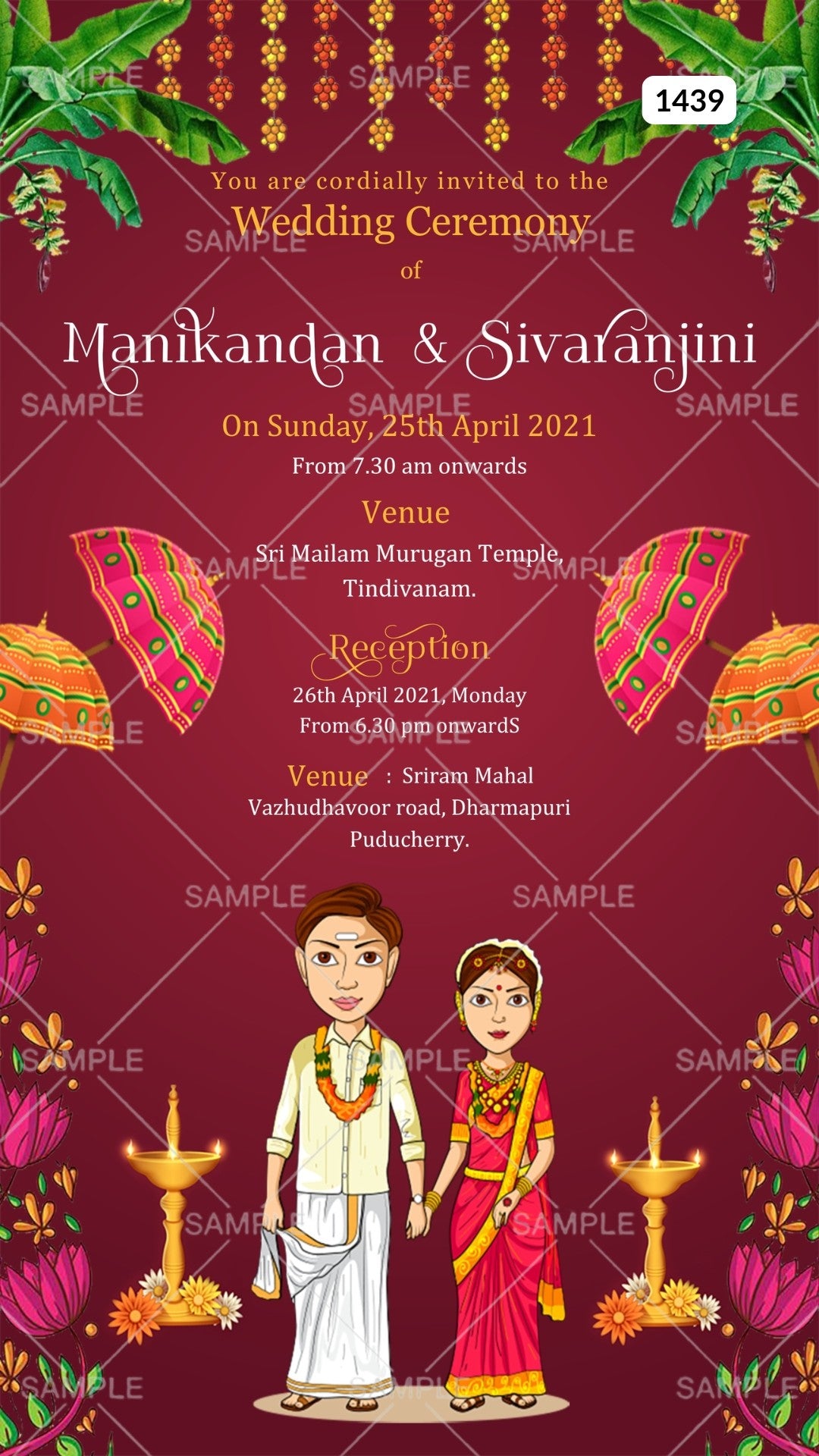 The traditional Theme of the Hindu Hindu digital invitation Canva Editable Template for a wedding ceremony is a maroon background color. This e-invite editable template is perfectly suitable for south indian families and it's available in the English language. It includes elements such as banana leaves, an umbrella, a diya, couple doodle, garland, and pink flowers. This card design can be customized online for free in Canva, and you can edit the couple's name, function name, date, time, venue, and regards. You can also share your card easily via WhatsApp or email.