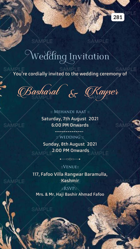 The Artistic Flowers Theme of the Hindu digital invitation Canva Editable for a wedding ceremony in a Navy blue background color. This e-invite editable template is perfectly suitable for the Kashmiri family and it's available in English language. It includes elements such as Brown flowers, and brown leaves. This card design can be customized online for free in Canva, and you can edit the couple's name, function name, date, time, venue, and regards. You can also share your card easily via WhatsApp or email.