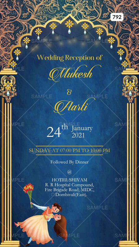 The Arch Theme of the Hindu Maharashtrian digital invitation Canva Editable for a wedding ceremony is in Navy blue background color. This e-invite editable template is perfectly suitable for the Marathi family and it's available in English language. It includes elements such as Couple doodle, a Golden arch, golden patterns, and string lights. This card design can be customized online for free in Canva, and you can edit the couple's name, function name, date, time, venue, and regards. You can also share your card easily via WhatsApp or email.