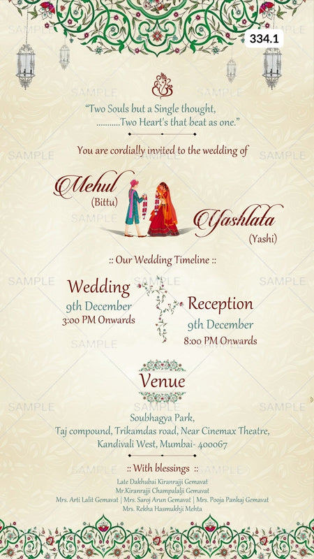 The Mandala Theme of the Hindu Maharashtrian digital invitation Canva Editable for a wedding ceremony in cream background color. This e-invite editable template is perfectly suitable for the Marathi family and it's available in English language. It includes elements such as the Ganesha logo, lantern, baraat doodle, mandala, and wedding couple doodle. This card design can be customized online for free in Canva, and you can edit the couple's name, function name, date, time, venue, and regards. You can also share your card easily via WhatsApp or email.