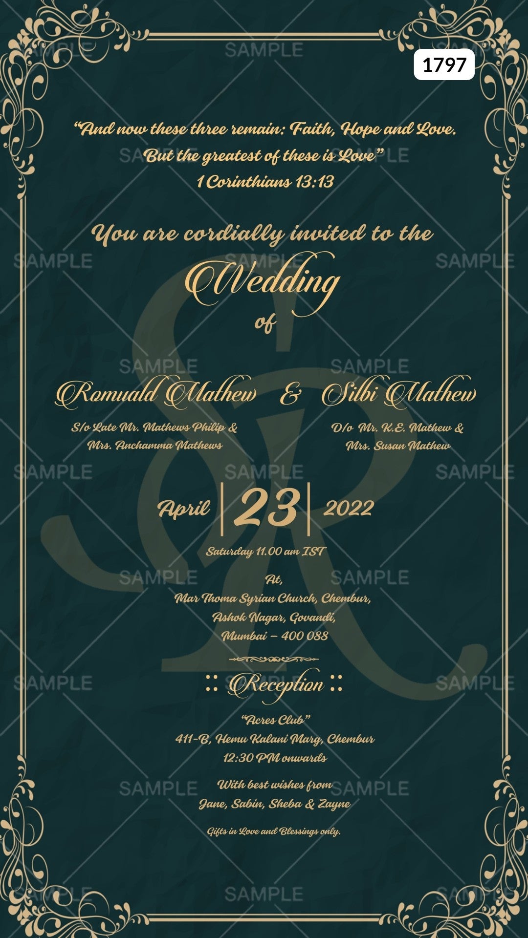 The minimalistic Theme of the Hindu Maharashtrian digital invitation Canva Editable Template for a wedding ceremony is in green background color. This e-invite editable template is perfectly suitable for the Marathi family and it's available in English language. It includes elements such as a golden border and, a couple logo. This card design can be customized online for free in Canva, and you can edit the couple's name, function name, date, time, venue, and regards. You can also share your card easily via WhatsApp or email.