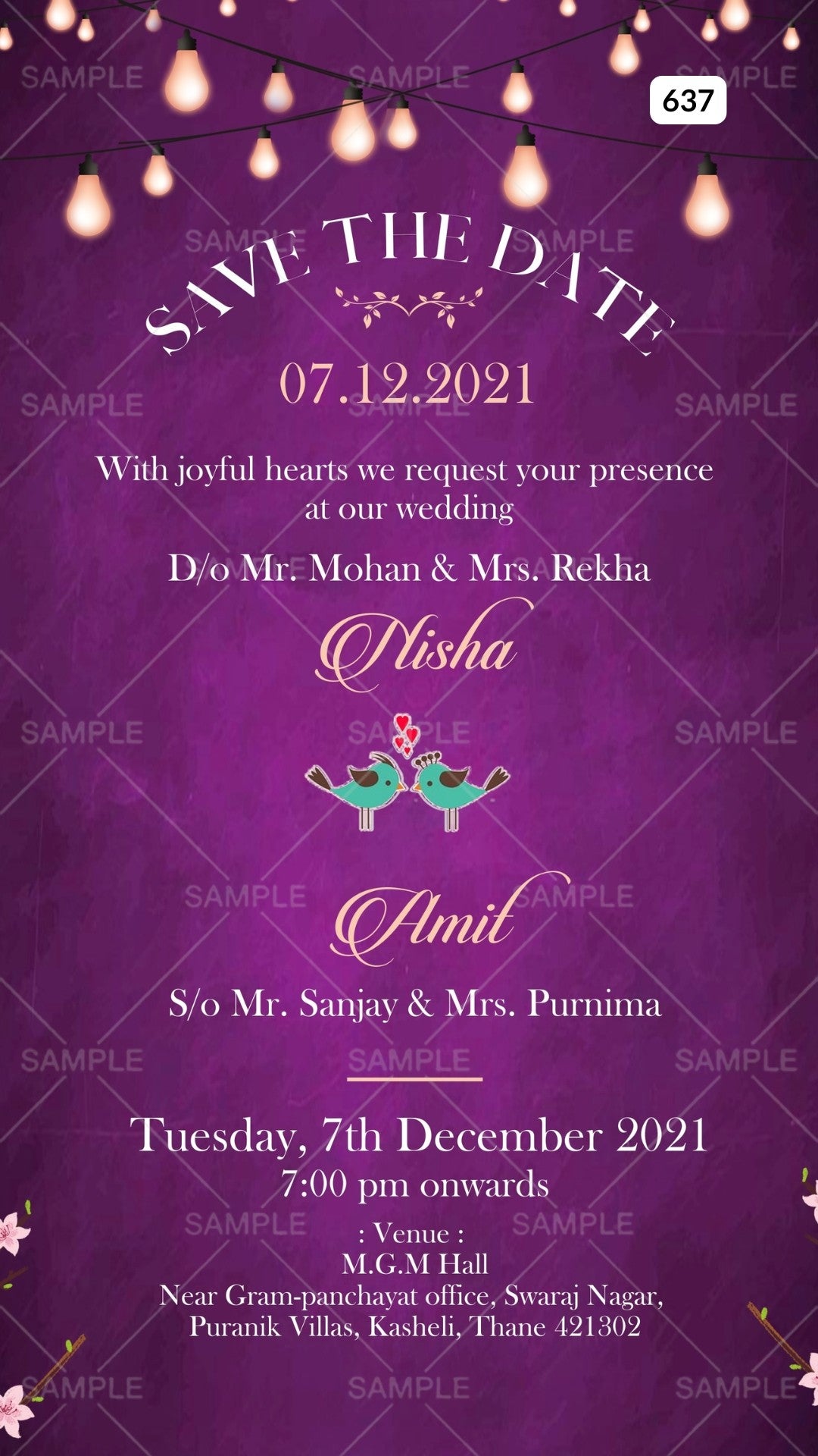 The Shining Theme of the Hindu maharashtrian digital invitation Canva Editable Template for wedding ceremony in Purple background color. This e-invite editable template is perfectly suitable for marathi family and it's available in English language. It includes elements such as Birds, string lights, pink flowers. This card design can be customized online for free in Canva, and you can edit the couple's name, function name, date, time, venue, and regards. You can also share your card easily via WhatsApp or email.