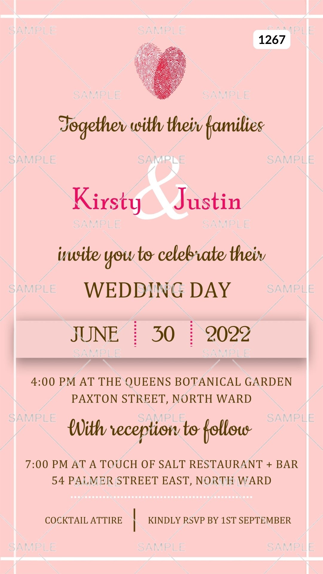 The fingerprint minimalistic Theme of the Hindu digital invitation Canva Editable Template for a wedding ceremony in pink background color. This e-invite editable template is perfectly suitable for modern families and it's available in the English language. It includes elements such as a finger print heart and, a white border. This card design can be customized online for free in Canva, and you can edit the couple's name, function name, date, time, venue, and regards. You can also share your card easily via WhatsApp or email.