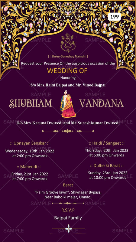 The Arch Theme of the Hindu north indian digital invitation Canva Editable for a wedding ceremony in Purple background color. This e-invite editable template is perfectly suitable for the bhojpuri family and it's available in English language. It includes elements such as a Wedding couple doodle, a Ganesha logo, golden arch frame. This card design can be customized online for free in Canva, and you can edit the couple's name, function name, date, time, venue, and regards. You can also share your card easily via WhatsApp or email.