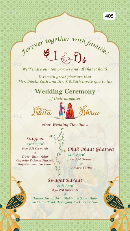The Arch Theme of the Hindu north indian digital invitation Canva Editable for a wedding ceremony is in Green, cream background color. This e-invite editable template is perfectly suitable for the Bhojpuri family and it's available in English language. It includes elements such as a Wedding couple doodle, an Artistic peacock, a couple logo, a golden arch frame, golden pattern. This card design can be customized online for free in Canva, and you can edit the couple's name, function name, date, time, venue, and regards. You can also share your card easily via WhatsApp or email.