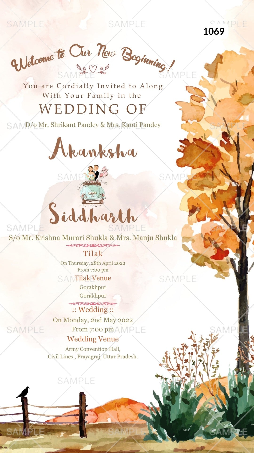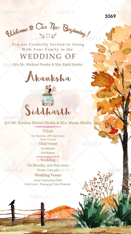 The Garden Theme of the Hindu north indian digital invitation Canva Editable for a wedding ceremony in brown splash background color. This e-invite editable template is perfectly suitable for the Bhojpuri family and it's available in English language. It includes elements such as a Car, couple doodle, a tree, birds, a fence, a mountain, and grass. This card design can be customized online for free in Canva, and you can edit the couple's name, function name, date, time, venue, and regards. You can also share your card easily via WhatsApp or email.