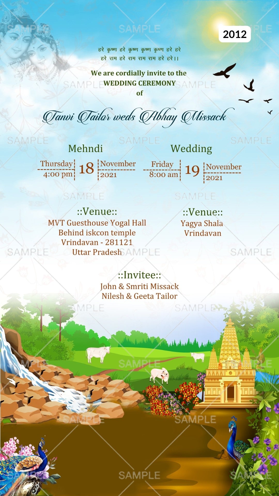 The garden Theme of the Hindu north indian digital invitation Canva Editable Template for a wedding ceremony in sky blue background color. This e-invite editable template is perfectly suitable for the Bhojpuri family and it's available in English language. It includes elements such as peacock, stone, waterfall, temple, cow, purple flowers, tree, Radha Krishna image, sun, birds, and red flowers. This card design can be customized online for free in Canva, and you can edit the couple's name, function name, date, time, venue, and regards. You can also share your card easily via WhatsApp or email.
