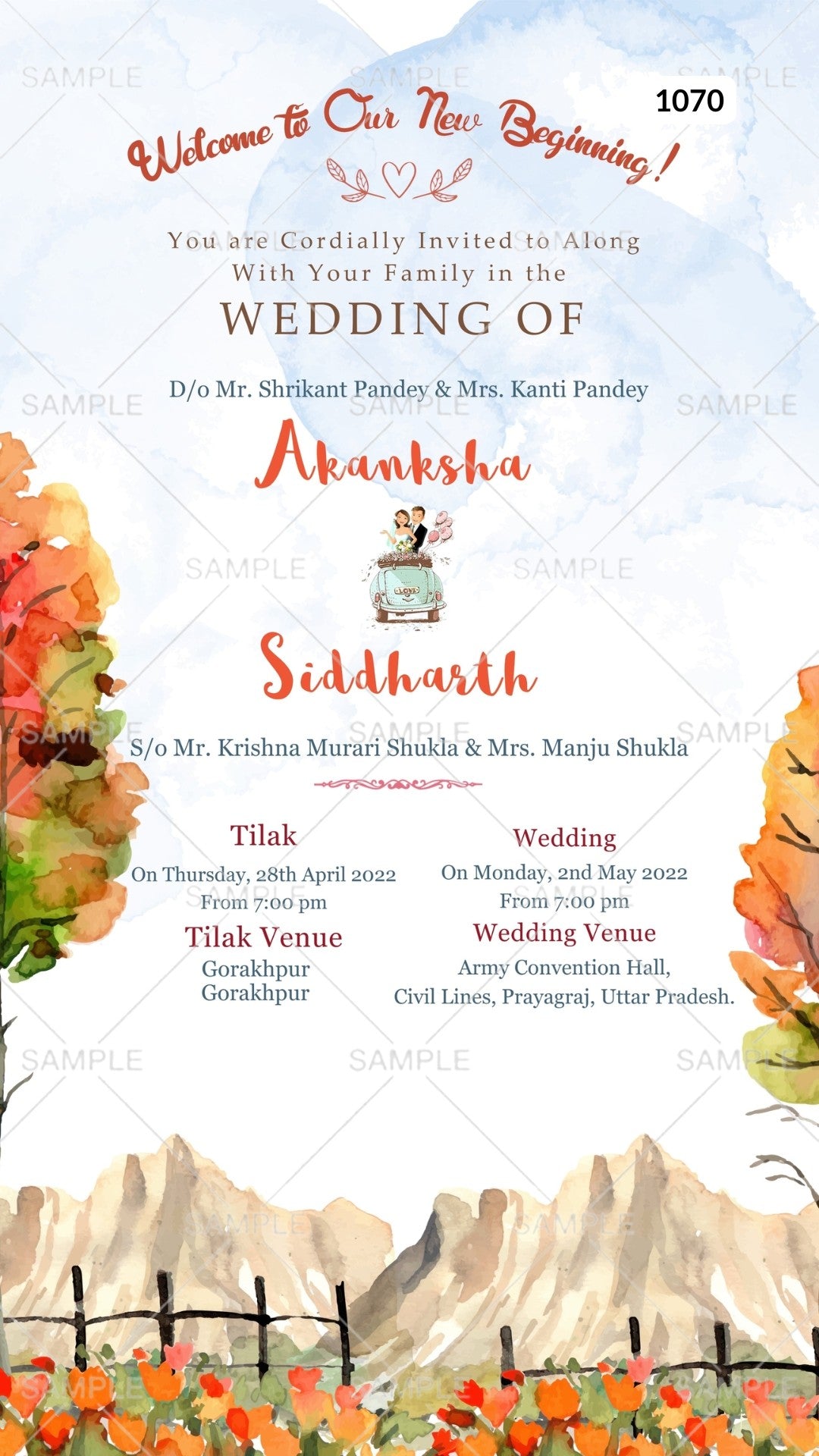 Wedding ceremony invitation card Canva Editable Template of hindu north indian bhojpuri family in english language with Mountain theme design 1070