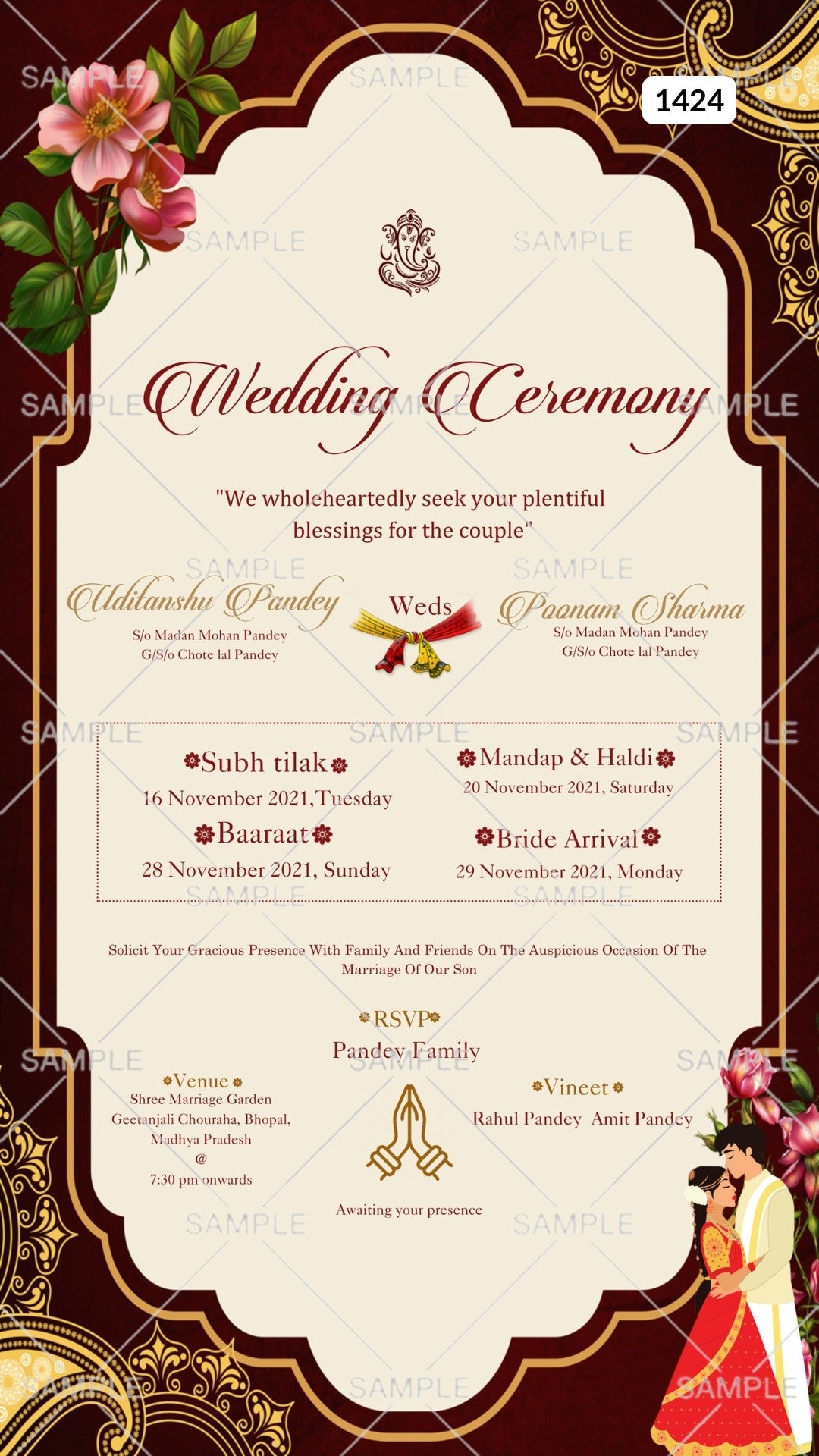 Wedding ceremony invitation card Canva Editable Template of hindu north indian family in english language with Arch theme design 1424