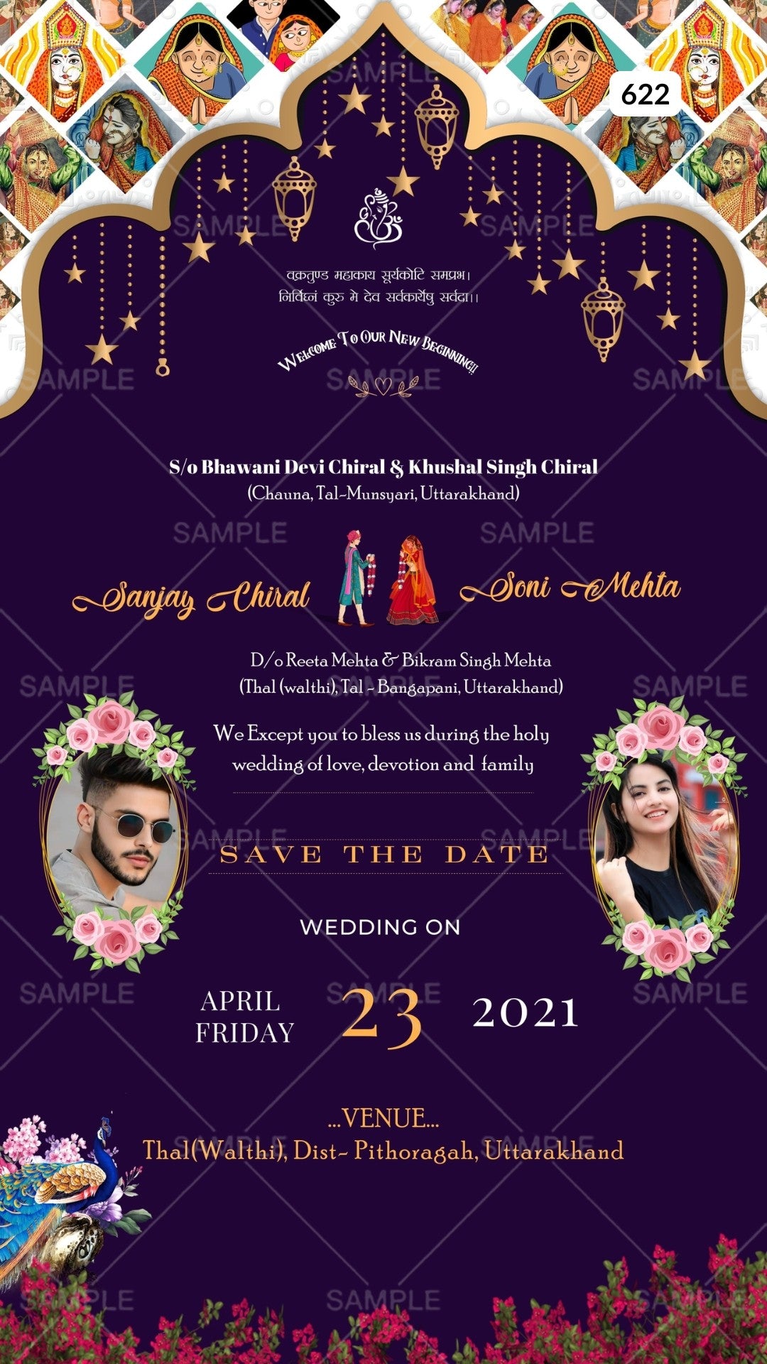 The Arch Theme of the Hindu North indian digital invitation Canva Editable for a wedding ceremony in Purple background color. This e-invite editable template is perfectly suitable and it's available in the English language. It includes elements such as a wedding couple doodle, Ganesha logo, peacock, red flowers, couple photos, lantern, arch, and leaves. This card design can be customized online for free in Canva, and you can edit the couple's name, function name, date, time, venue, and regards. You can also share your card easily via WhatsApp or email.