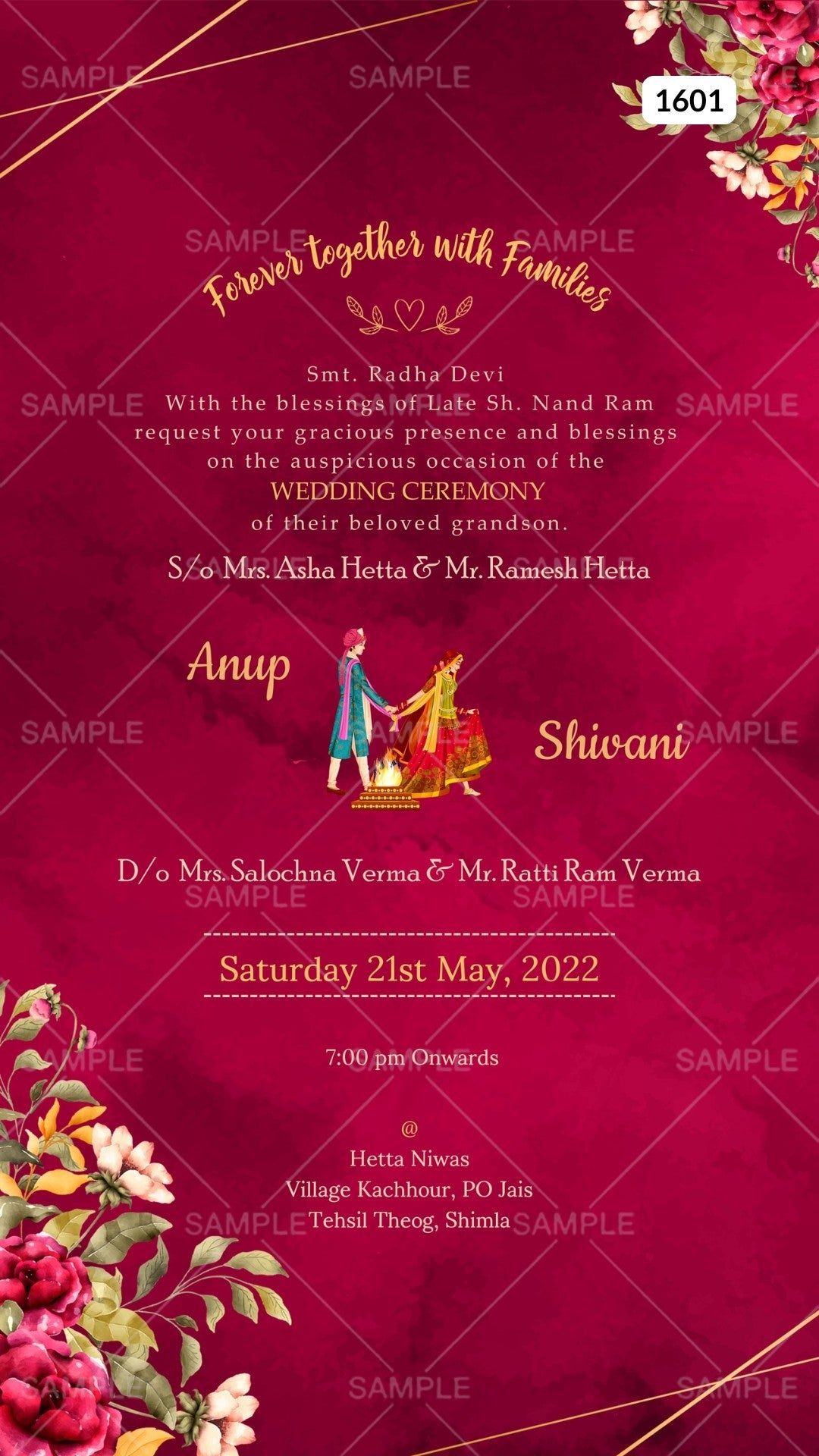The minimalistic Theme of the Hindu digital invitation Canva Editable Template for a wedding ceremony in pink background color. This e-invite editable template is perfectly suitable for north indian families and it's available in the English language. It includes elements such as wedding couple doodle, golden lines, red flowers, pink flowers, and green leaves. This card design can be customized online for free in Canva, and you can edit the couple's name, function name, date, time, venue, and regards. You can also share your card easily via WhatsApp or email.