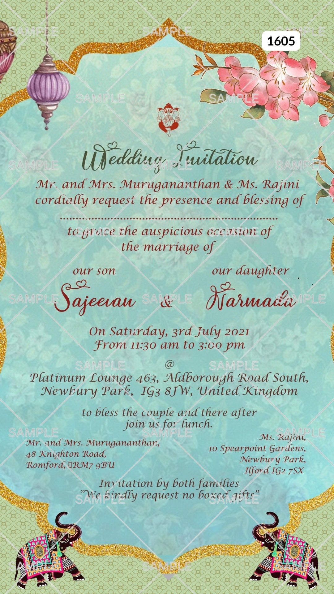 The traditional arch Theme of the Hindu digital invitation Canva Editable Template for a wedding ceremony in green, and blue background color. This e-invite editable template is perfectly suitable for a north indian family and it's available in English language. It includes elements such as the Ganesha logo, elephants, lanterns, pink flowers, golden patterns, and a golden arch frame. This card design can be customized online for free in Canva, and you can edit the couple's name, function name, date, time, venue, and regards. You can also share your card easily via WhatsApp or email.