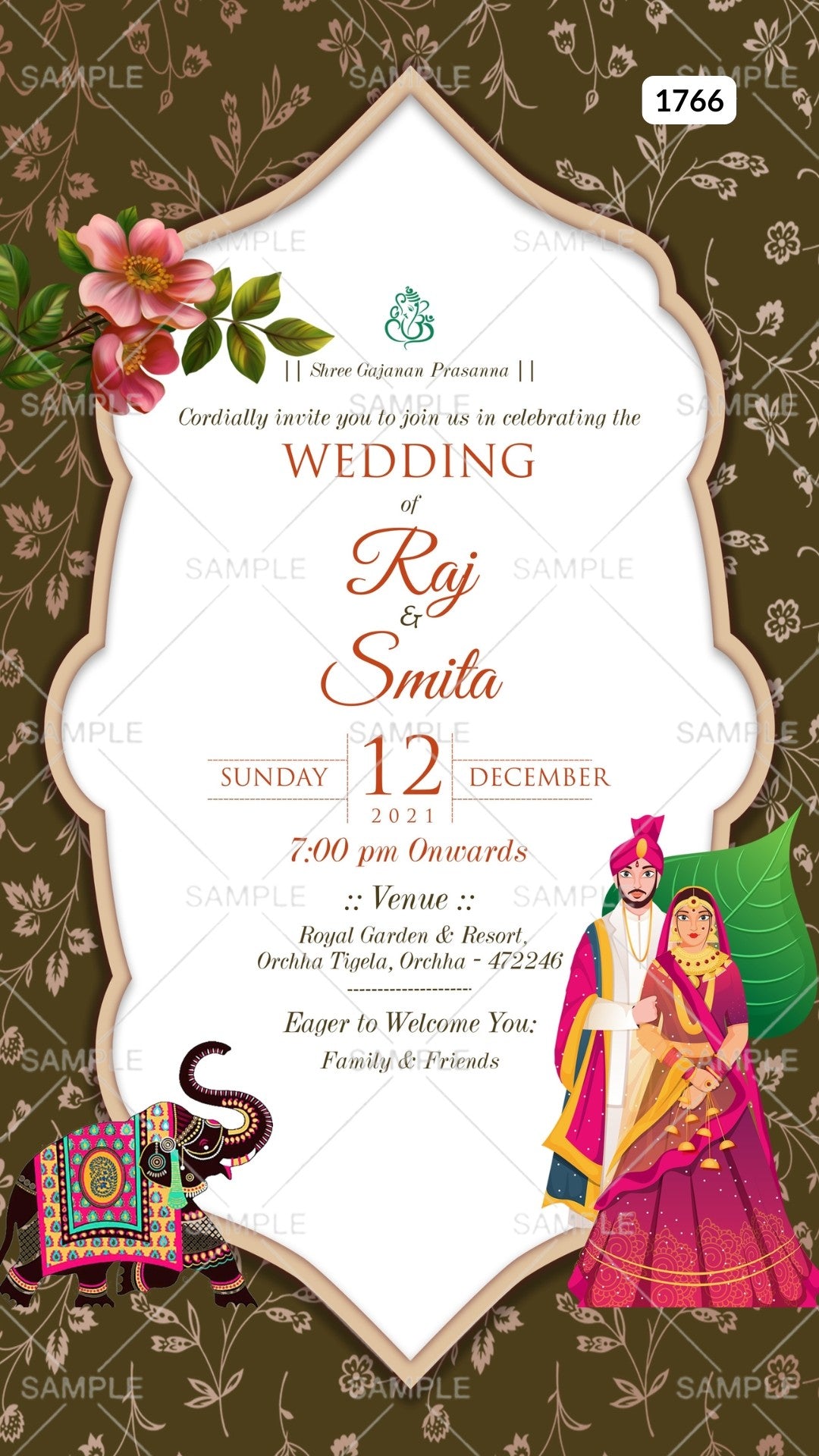 The traditional Theme of the Hindu north indian digital invitation Canva Editable Template for a wedding ceremony is in the brown background color. This e-invite editable template is perfectly suitable and it's available in the English language. It includes elements such as the Ganesha logo, red flowers, wedding couple doodle, elephant, and leaf patterns. This card design can be customized online for free in Canva, and you can edit the couple's name, function name, date, time, venue, and regards. You can also share your card easily via WhatsApp or email.