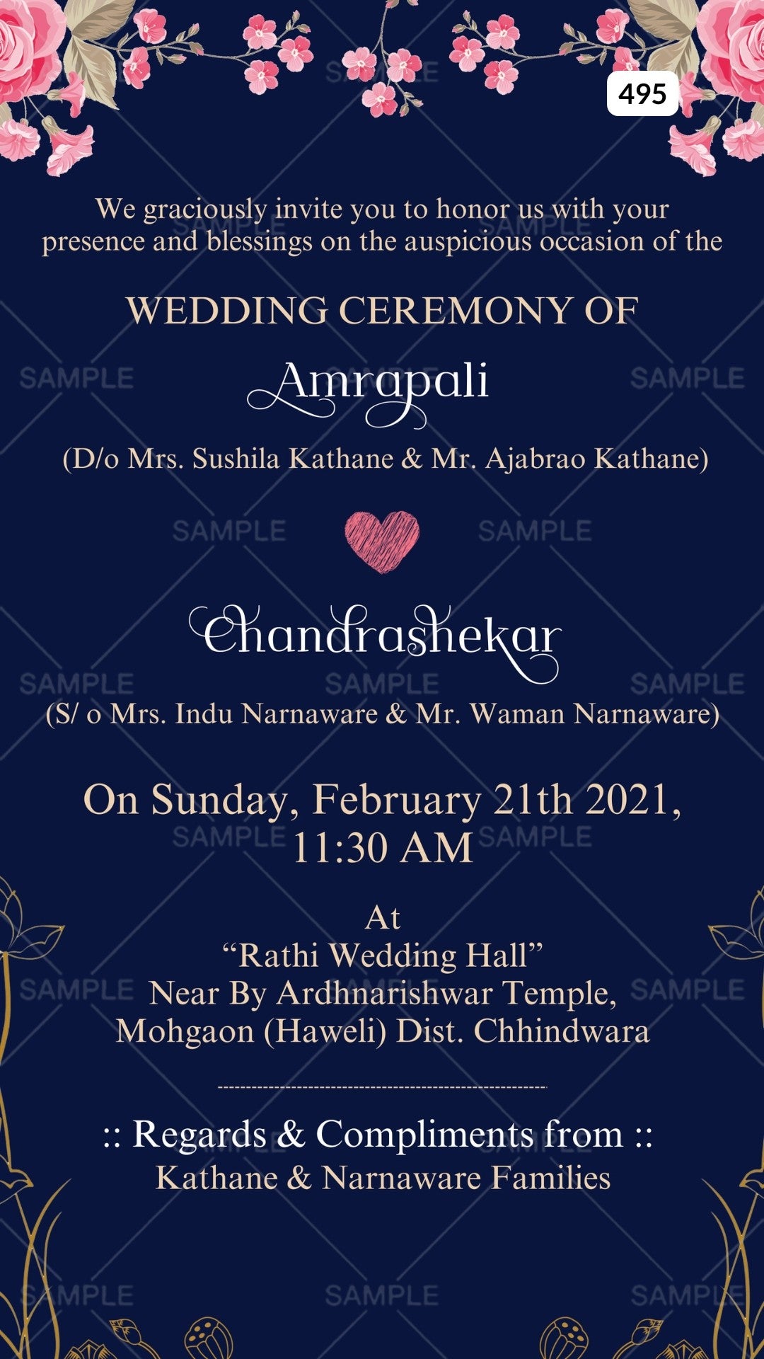The Floral Theme of the Hindu north indian digital invitation Canva Editable for a wedding ceremony in Navy blue background color. This e-invite editable template is perfectly suitable and it's available in the English language. It includes elements such as Heart, pink flowers, green leaves, and golden leaves. This card design can be customized online for free in Canva, and you can edit the couple's name, function name, date, time, venue, and regards. You can also share your card easily via WhatsApp or email.