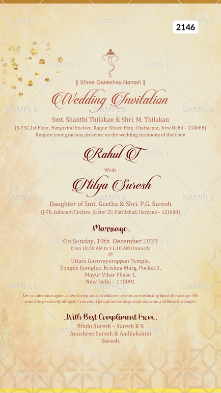 The minimalistic Theme of the Hindu Punjabi digital invitation Canva Editable Template for a wedding ceremony is in pastel brown background color. This e-invite editable template is perfectly suitable for the haryanvi family and it's available in English language. It includes elements such as golden glitter, the Ganesha logo, golden frame. This card design can be customized online for free in Canva, and you can edit the couple's name, function name, date, time, venue, and regards. You can also share your card easily via WhatsApp or email.