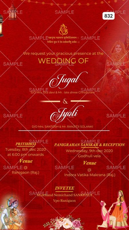The minimalistic Theme of the Hindu Rajasthani digital invitation Canva Editable for a wedding ceremony is in red background color. This e-invite editable template is perfectly suitable for the Marwari family and it's available in English language. It includes elements such as the Ganesha logo, string lights, a lantern, a Radha Krishna image, couple doodle, pink flowers, and white flowers. This card design can be customized online for free in Canva, and you can edit the couple's name, function name, date, time, venue, and regards. You can also share your card easily via WhatsApp or email.