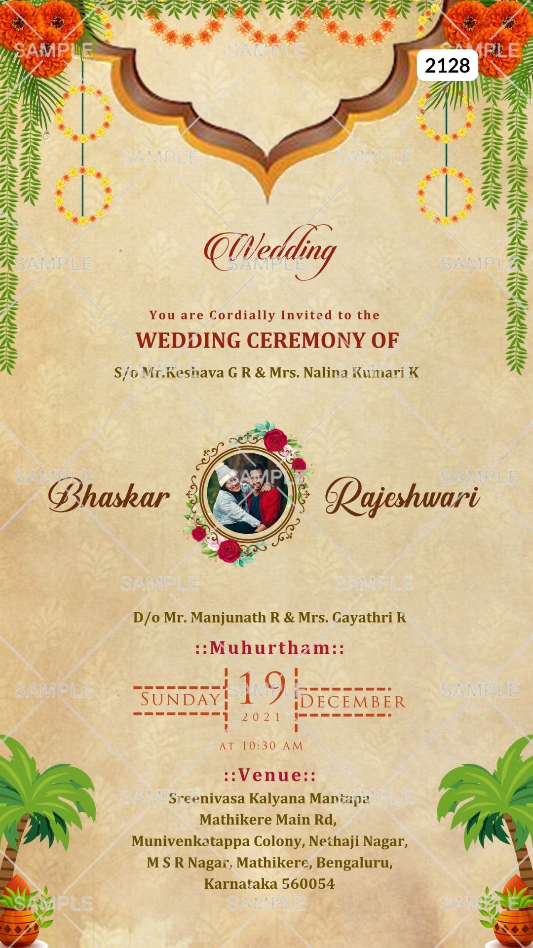Wedding ceremony invitation card Canva Editable Template of hindu south indian kannada family in english language with couple photo traditional theme design 2128