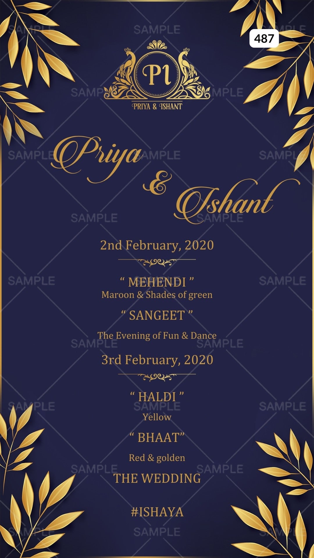 The floral Theme of the Hindu south indian digital invitation Canva Editable for wedding ceremony in blue background color. This e-invite Editable Template is perfectly suitable for kannada family and it's available in English language. It includes elements such as golden leaves, name logo. This card design can be customized online for free in Canva, and you can edit the function name, date, time, venue, and regards. You can also share your card easily via WhatsApp or email.