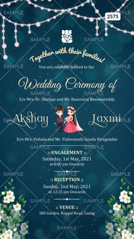The glittery Theme of the Hindu south indian digital invitation Canva Editable Template for a wedding ceremony in the blue background color. This e-invite editable template is perfectly suitable for the Kannada families and it's available in the English language. It includes elements such as a Ganesha logo, string lights, couple doodle, white flowers, green leaves, and glitter. This card design can be customized online for free in Canva, and you can edit the couple's name, function name, date, time, venue, and regards. You can also share your card easily via WhatsApp or email.