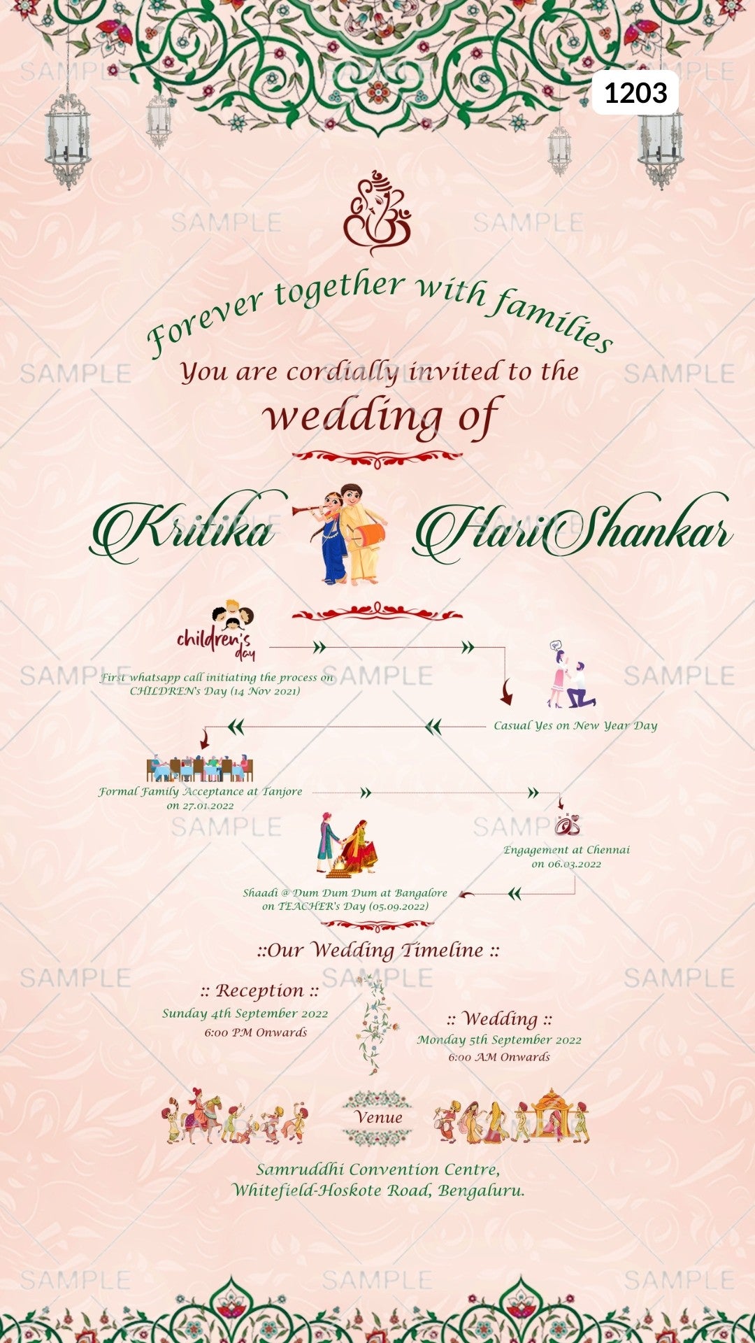 The traditional theme of the Hindu South Indian Family Wedding Ceremoy Digital Invitation Canva Editable Template is a blush pink background color. This e-invite card is perfectly suitable for Tamil families and is available in the English language. It includes elements such as Mandala art, lantrn, couple doddle, Â This card design can be customized online for free in Canva, and you can edit Function Name, Couple Name, Date, Time, Venue, and Regards. You can also share your card easily via WhatsApp or email.