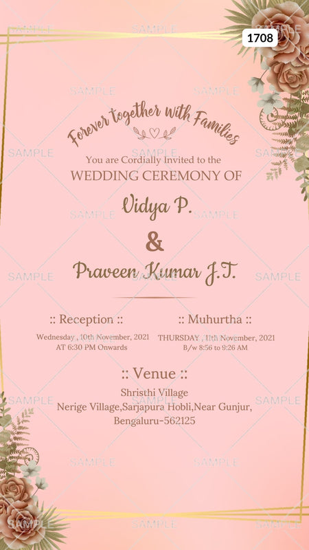 The minimalistic Theme of the Hindu south indian digital invitation Canva Editable Template for a wedding ceremony is in the pink background color. This e-invite editable template is perfectly suitable for the Kannada family and it's available in English language. It includes elements such as brown leaves, orange flowers, golden frame. This card design can be customized online for free in Canva, and you can edit the couple's name, function name, date, time, venue, and regards. You can also share your card easily via WhatsApp or email.