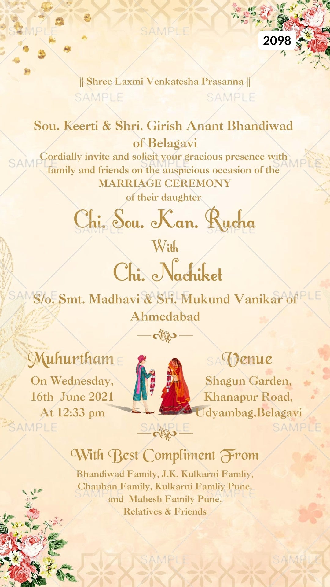 The minimalistic Theme of the Hindu south indian digital invitation Canva Editable Template for a wedding ceremony is in the brown background color. This e-invite editable template is perfectly suitable for the Kannada family and it's available in English language. It includes elements such as a wedding couple doodle, golden glitter, golden leaves, and red flowers. This card design can be customized online for free in Canva, and you can edit the couple's name, function name, date, time, venue, and regards. You can also share your card easily via WhatsApp or email.