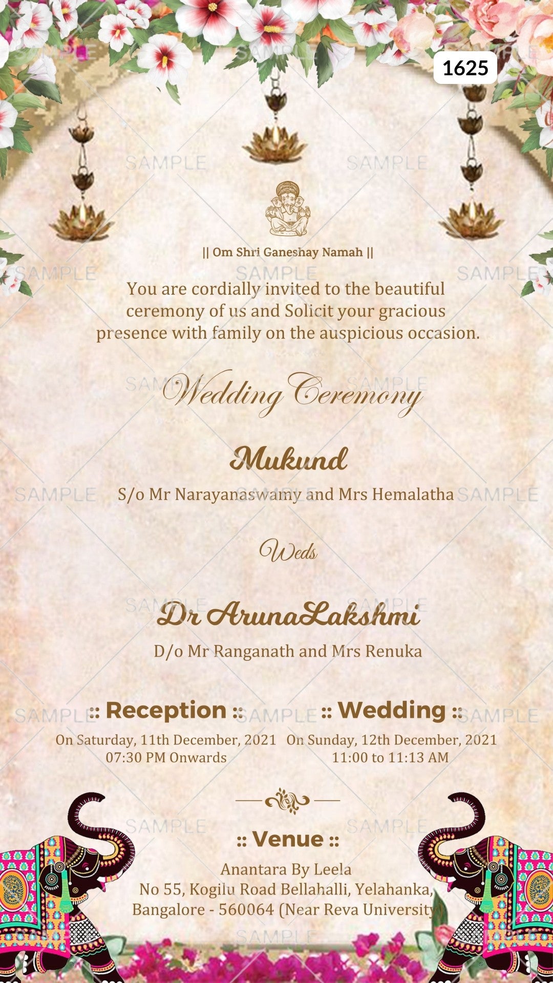 The traditional Theme of the Hindu south indian digital invitation Canva Editable Template for wedding ceremonies is in pastel brown background color. This e-invite editable template is perfectly suitable for the kannada family and it's available in English language. It includes elements such as white flowers, elephants, pink flowers, Ganesha logo, and diya. This card design can be customized online for free in Canva, and you can edit the couple's name, function name, date, time, venue, and regards. You can also share your card easily via WhatsApp or email.