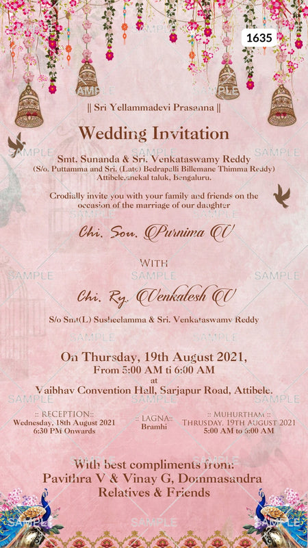 The traditional Theme of the Hindu south indian digital invitation Canva Editable Template for wedding ceremony in pink splash background color. This e-invite editable template is perfectly suitable for kannada family and it's available in English language. It includes elements such as peacock, bells, birds, pink tulips. This card design can be customized online for free in Canva, and you can edit the couple's name, function name, date, time, venue, and regards. You can also share your card easily via WhatsApp or email.