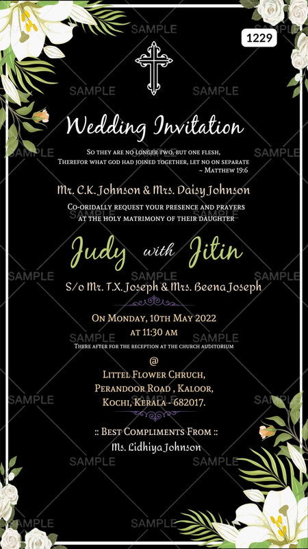 The floral Theme of the Hindu south indian digital invitation Canva Editable Template for a wedding ceremony is on a black background color. This e-invite editable template is perfectly suitable for the malayali family and it's available in English language. It includes elements such as white flowers, green leaves, a Christian cross, white border. This card design can be customized online for free in Canva, and you can edit the couple's name, function name, date, time, venue, and regards. You can also share your card easily via WhatsApp or email.
