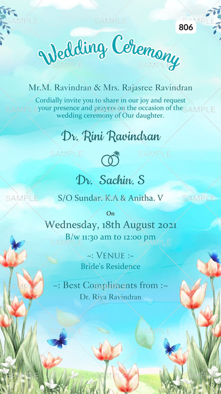 The Floral Theme of the Hindu south indian digital invitation Canva Editable for a wedding ceremony in Sky blue background color. This e-invite editable template is perfectly suitable for the Malayali family and it's available in English language. It includes elements such as a Couple ring, orange flowers, blue flowers, green leaves, grass, butterflies, and blue tulips. This card design can be customized online for free in Canva, and you can edit the couple's name, function name, date, time, venue, and regards. You can also share your card easily via WhatsApp or email.