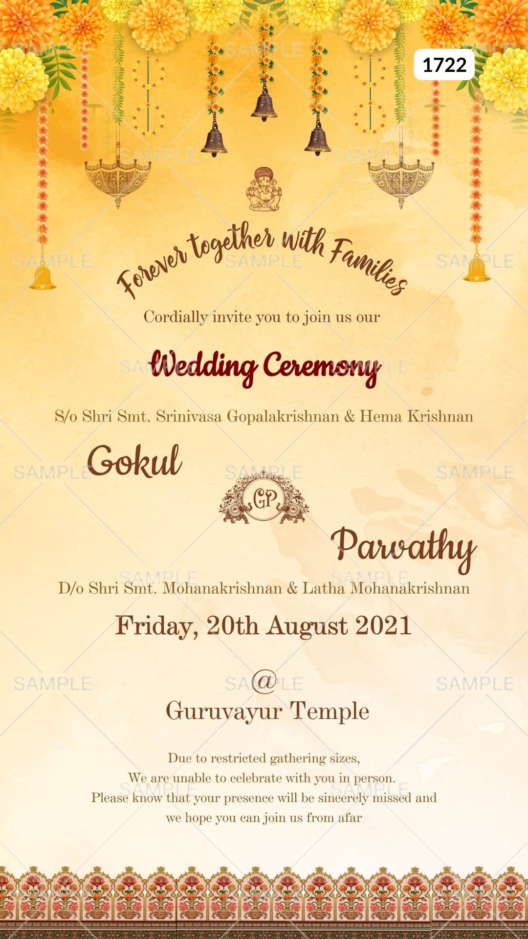 Wedding ceremony invitation card Canva Editable Template of hindu south indian malayali family in english language with traditional theme design 1722