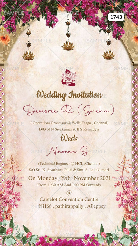 The traditional Theme of the Hindu south Indian digital invitation Canva Editable Template for wedding ceremonies is in pastel brown background color. This e-invite editable template is perfectly suitable for the Malayali family and it's available in English language. It includes elements such as the Ganesha logo, Diya, pink flowers, orange flowers, and traditional gate. This card design can be customized online for free in Canva, and you can edit the couple's name, function name, date, time, venue, and regards. You can also share your card easily via WhatsApp or email.