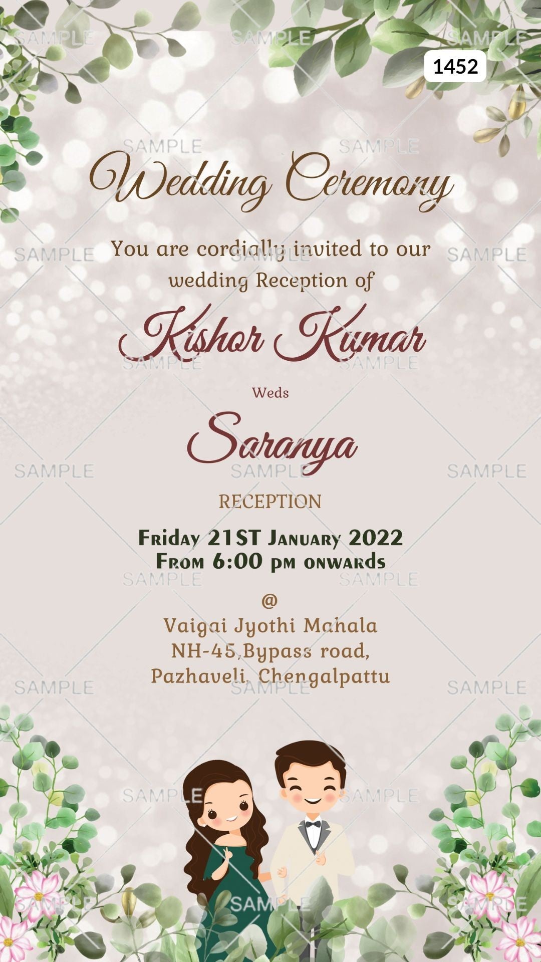 The artistic leaves Theme of the Hindu south indian digital invitation Canva Editable Template for a wedding ceremony in the grey background color. This e-invite editable template is perfectly suitable for a Tamil family and it's available in the English language. It includes elements such as couple doodle, green leaves, pink flowers, and white glitter. This card design can be customized online for free in Canva, and you can edit the couple's name, function name, date, time, venue, and regards. You can also share your card easily via WhatsApp or email.