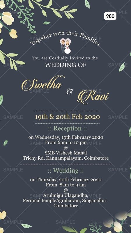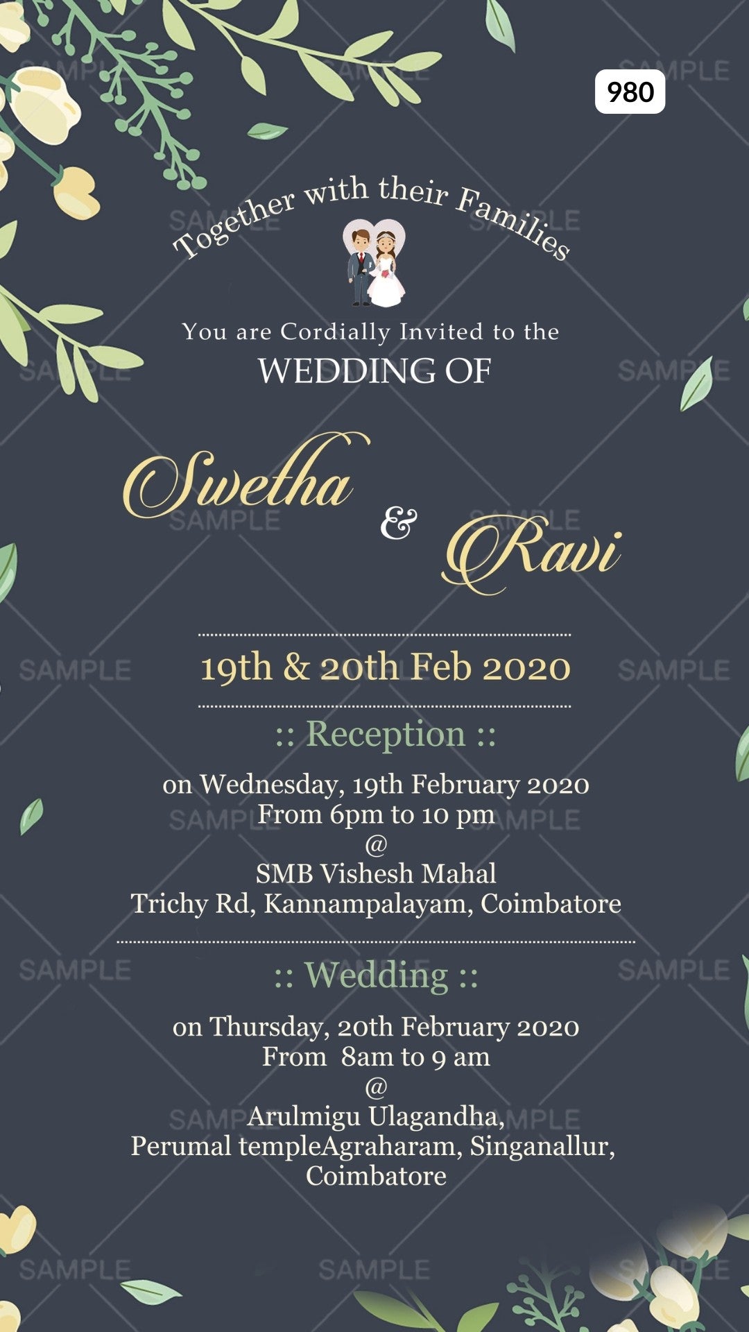 Wedding ceremony invitation card Canva Editable Template of hindu south indian tamil family in english language with Artistic leaves theme design 980