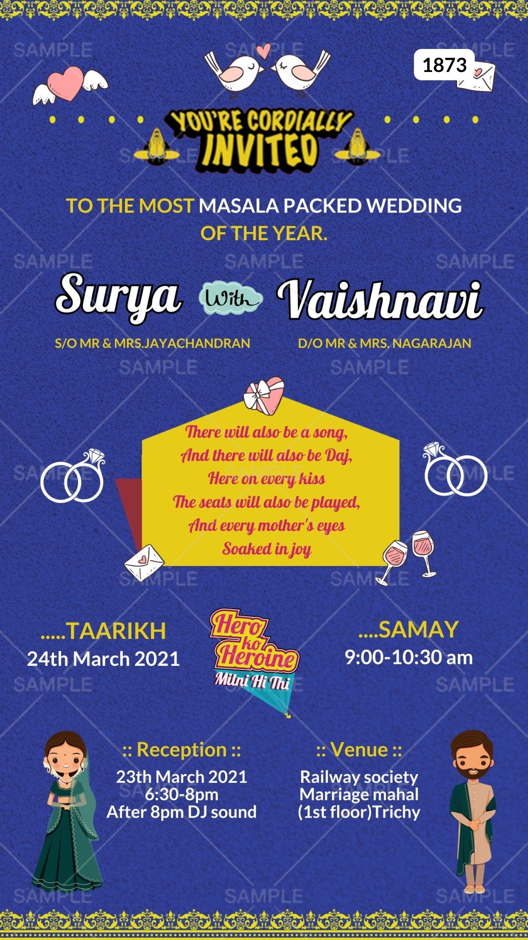 The Bollywood Theme of the Hindu south indian digital invitation Canva Editable Template for a wedding ceremony is in the blue background color. This e-invite editable template is perfectly suitable for a Tamil family and it's available in the English language. It includes elements such as birds, couple rings, cocktail glasses, couple doodle, envelopes, and namaste icons. This card design can be customized online for free in Canva, and you can edit the couple's name, function name, date, time, venue, and regards. You can also share your card easily via WhatsApp or email.