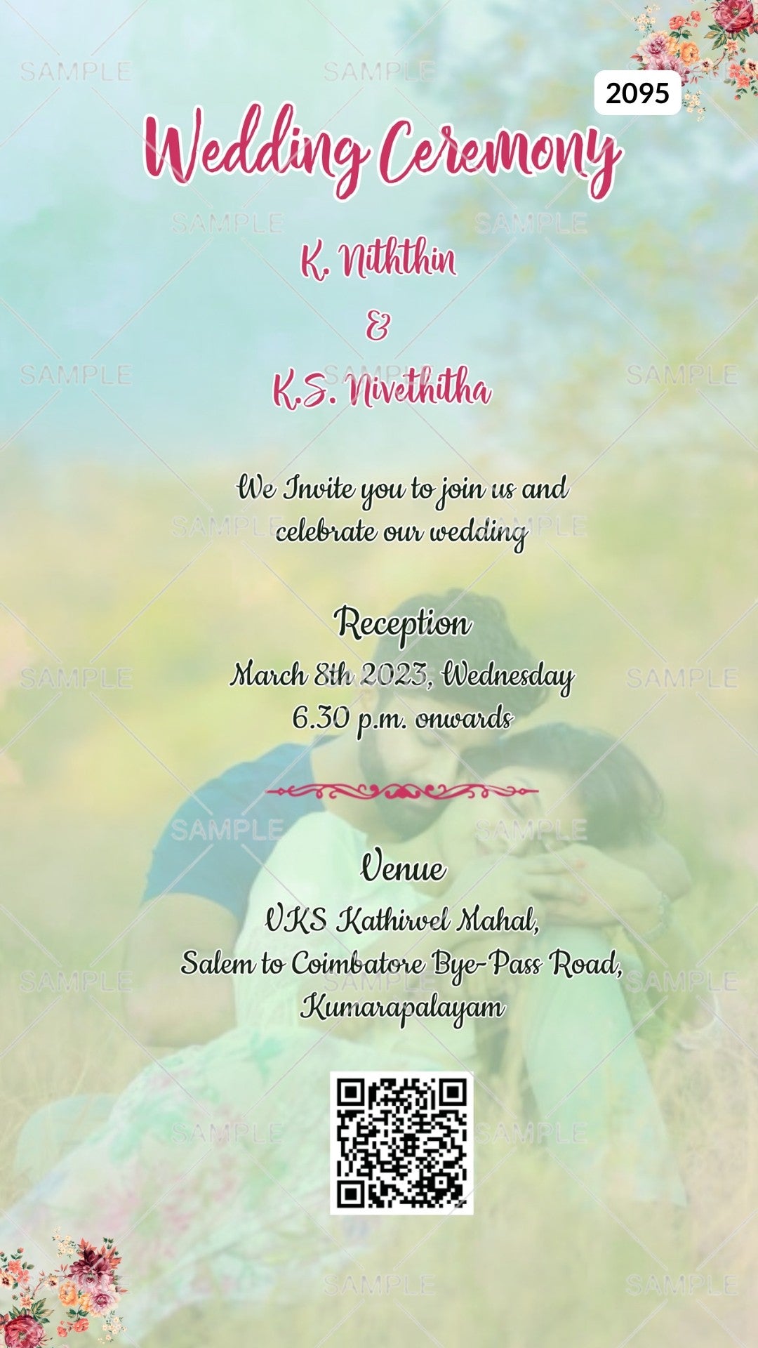 Wedding ceremony invitation card Canva Editable Template of hindu south indian tamil family in english language with couple photo garden theme design 2095